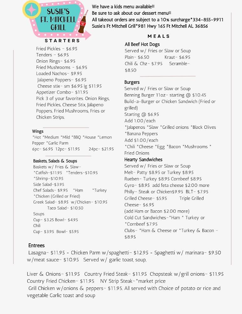 Welcome to Susie's Fort Mitchell Grill, where delicious meals and delightful desserts come together in a warm, welcoming atmosphere. Located at 981 AL-165, Fort Mitchell, AL, we offer a full-service dining experience with an enticing lunch and dinner menu. Enjoy a variety of options from hearty meals to sweet treats, including cakes, brownies, pies, and ice cream. Whether you choose to dine in, grab takeout, or enjoy our outdoor terrace, we promise exceptional service and a vibrant ambiance, perfect for families, solo diners, and anyone who loves great food. Join us for a memorable dining experience in the heart of Fort Mitchell!